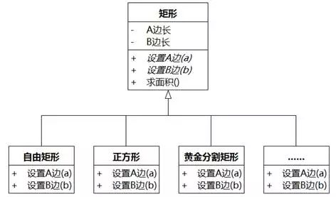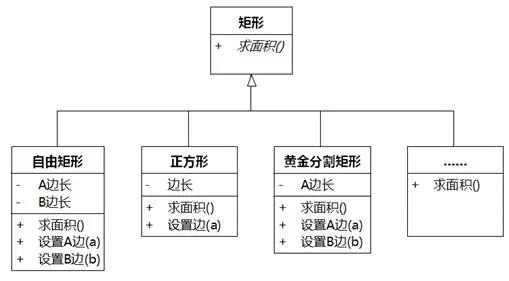 或者如图8-86,把超类“矩形”到底保留几个边长属性以及如何求面积的实现下放到子类。这样的处理相当于把邻边互有依赖的领域知识放在属性中,而不是放在操作中。