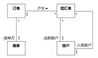 如果是给关联命名,最好给名称添加一个阅读方向,如图8-100所示,方向指示领域知识为“订单产生结汇单”。不过要注意,这个阅读方向只是为了方便理解领域知识,和关联的导航方向没有关系。有的建模工具不支持标注关联方向,可以通过统一偏向某一侧来表达阅读方向。