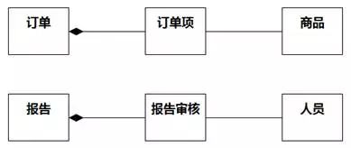 也就是说,部分对象只应该作为整体对象的一部分存在,不应独立存在,所以部分类的命名往往有整体类的味道,如图8-93所示,“订单”和“订单项”之间的关联是组合,但接下来的“订单项”和“商品”之间的关联不是组合;同样,“报告”和“报告审核”之间的关联是组合,但接下来的“报告审核”和“人员”之间的关联不是组合。