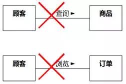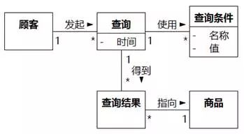 如果系统确实要维护查询和浏览的信息,两个类之间的关联当然可以存在,不过未必是直接关联,很可能是像图8-96。常见的电子商务系统中,需要维护的应该是图8-96上部的三个类:顾客、查询和查询条件,这样顾客可以反复使用之前设置过的查询条件。