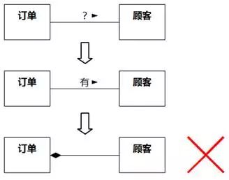 聚合/组合务必慎用。如果没有足够的证据,应该先建模为普通关联。有的建模人员懒得给普通关联想合适的名字,干脆一概以“有”称之,例如“订单有顾客”,然后得到错误的聚合/组合关系,如图8-94所示。