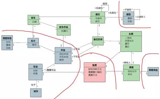 引入聚合/组合,相当于把类图分区,每个区找一个区长作为责任分配的起点。这是一项十分重要的分析技能。例如图8-92就是一张餐饮领域的类图,可以看出右上角“顾客”分区的领域概念和左上角“餐台”分区的领域概念所受的影响因素应该有较大差别。
