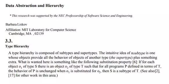 矩形和正方形的问题经常伴随着Liskov替换原则(LSP)的讨论。LSP是Barbara Liskov在1988年提出的关于基类型和子类型的原则[Liskov 1988],原文如图8-83所示。Bertrand Meyer[Meyer 1997]使用契约的观点解释了为什么正方形和矩形之间泛化关系违反了LSP:子类操作的后置条件弱于超类。