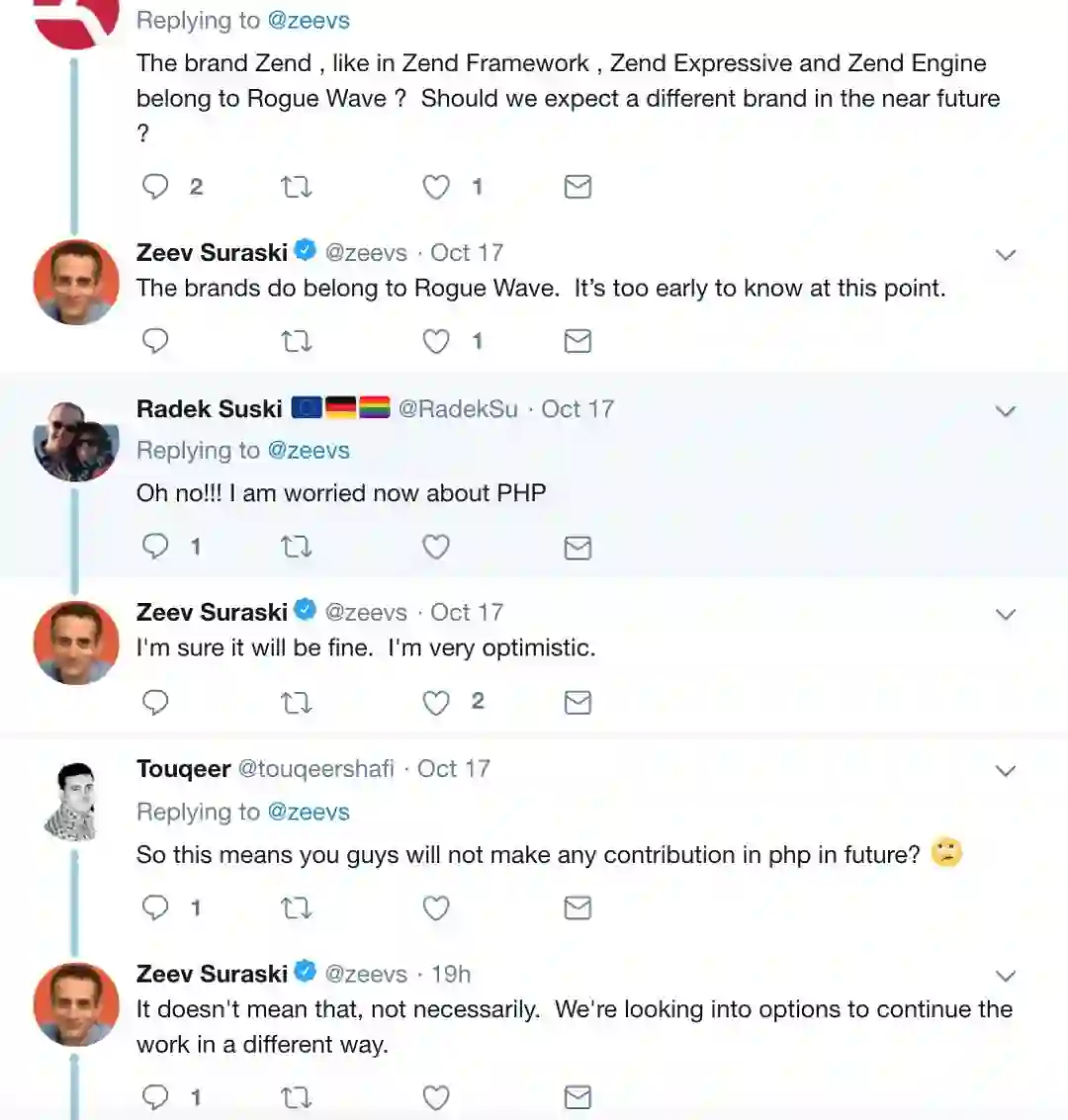 2018年10月17日,Zeev Suraski 在其个人博客上表示,非常感激 Rogue Wave 在过去的三年里一直庇护着他和团队进行 Zend Engine 的相关开发工作。不过,Rogue Wave 最近做出了一项战略决策,将其后续工作重点放在 Zend Server 部分。因此,Zeev Suraski 和他的团队 - 包括 Dmitry Stogov、Matthew Weier O'Phinney 和 Enrico Zimuel 决定将离开公司并寻找新的机会。