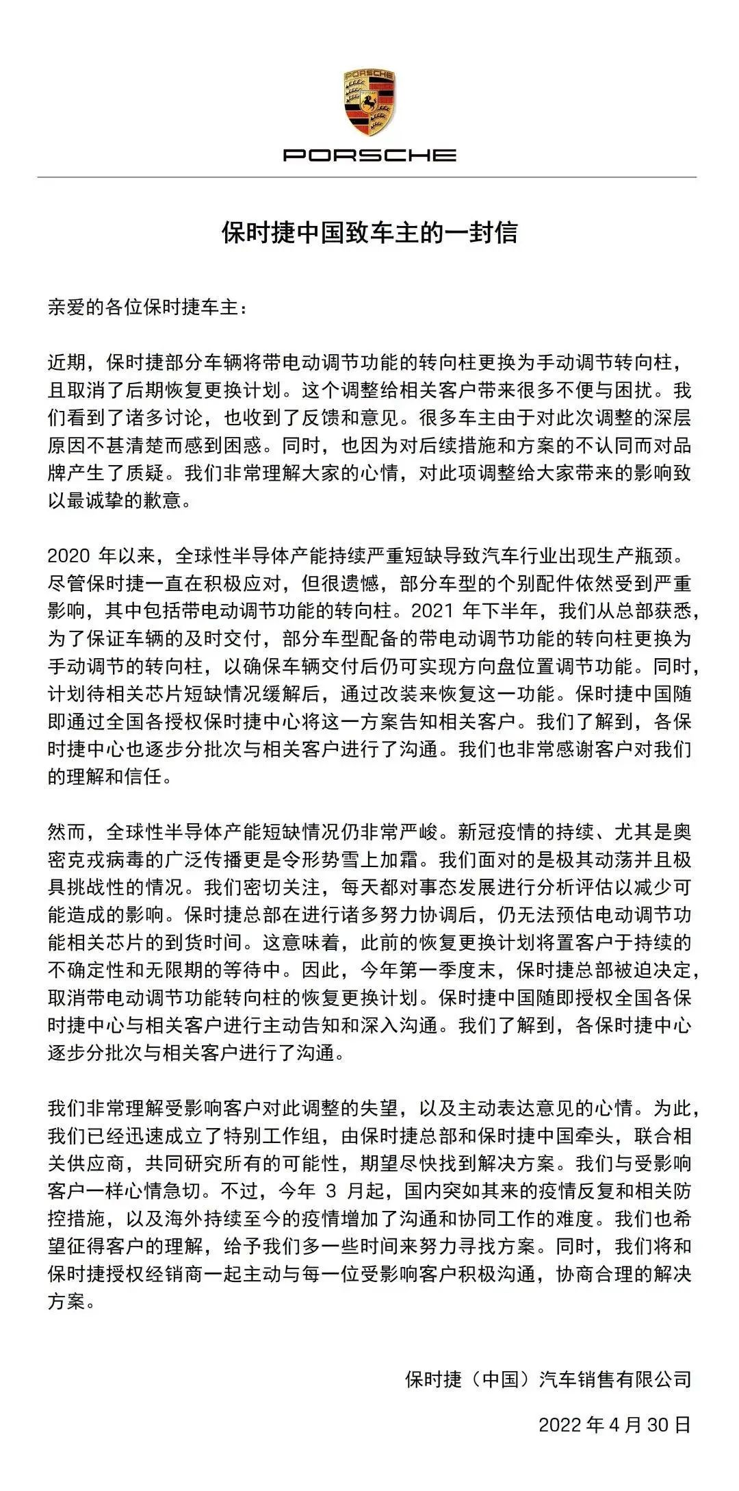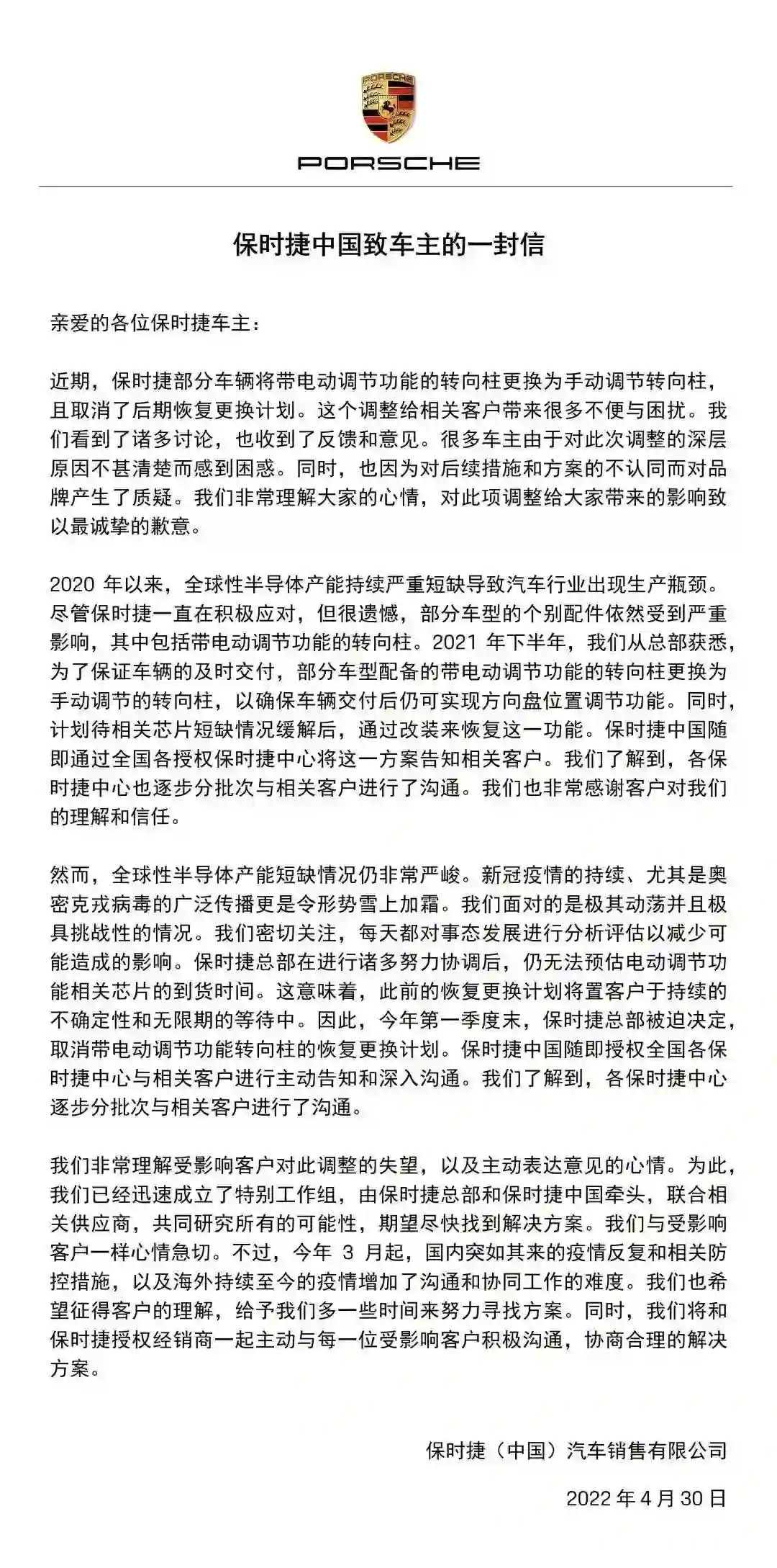 4月30日,保时捷新闻中心发布公告《保时捷中国致车主的一封信》,对近日车主因减配而引发的维权事件进行回复,向车主致歉。此前,有车主控诉自己订购的保时捷遭到官方无故减配。原本保时捷承诺因芯片供应不足,暂时将车辆减装为“手动转向柱”,后续将免费为车主升级“电动转向柱”。但现在又改口不予免费升级,百万豪车遭减配,仅提供2300元代金券补偿。(新浪汽车)
