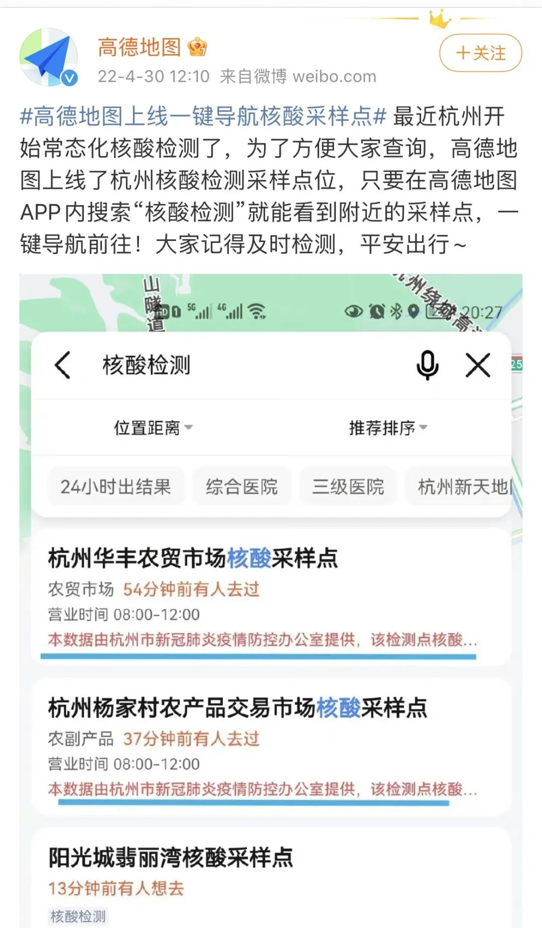 高德地图近日上线杭州核酸检测采样点。杭州市民在高德地图APP中搜索“核酸检测”,即可看到附近的核酸检测点。点开可查看具体位置、距离、抵达时长等信息。(快科技)