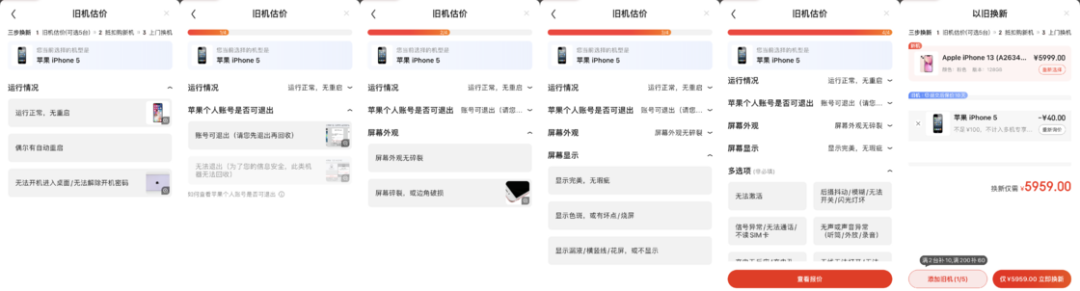 旧机回收的业务是京东和爱回收合作的,所以旧机回收的流程是由爱回收负责。不同的手机型号旧机估价的流程会有所差异。在完成旧机估价后就可以提交新机的订单了。这里需要注意的是,如果旧手机回收价格在 50 元以内,则不支持上门回收。