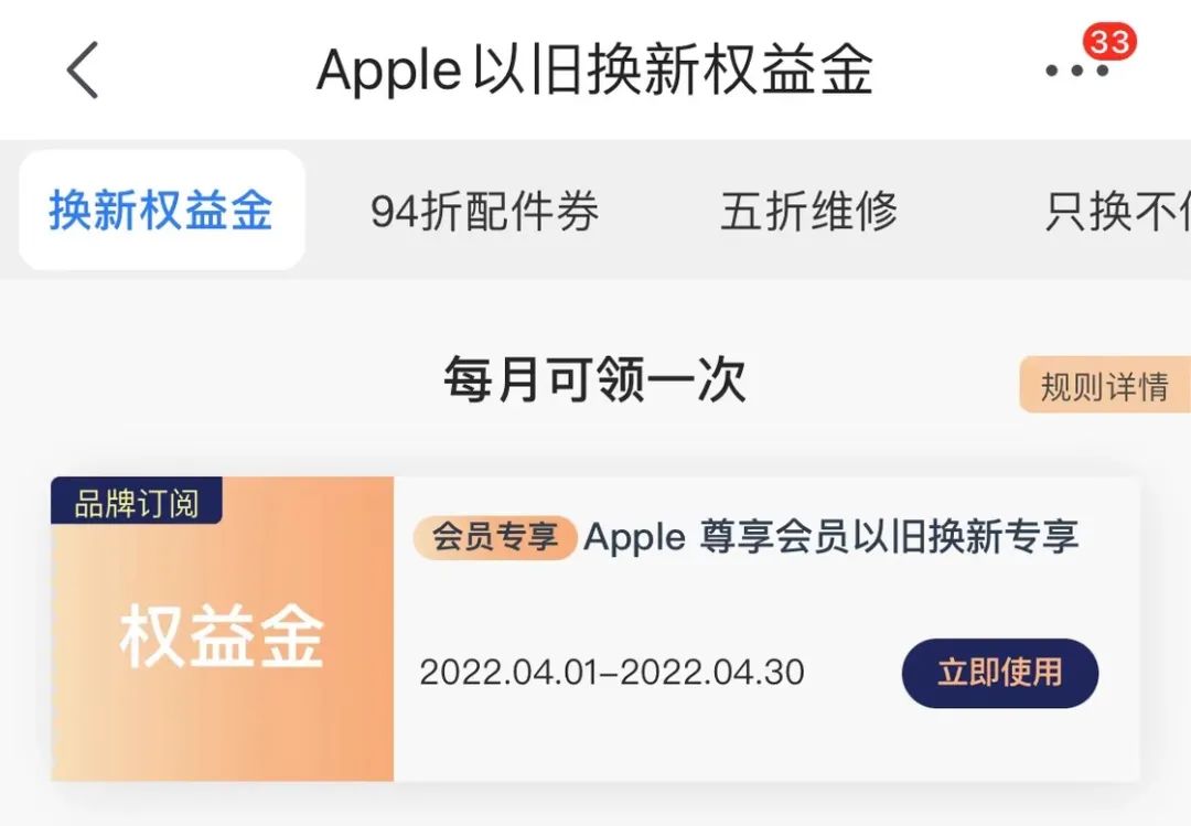 94 折以旧换新是另外一项比较有价值的权益,店铺会员每个自然月手动点击领取 1 次以旧换新权益金,整个会员期限内累计最多可领取 12 张,超期未领取则自动失效,并且对应的权益需在领取当月的最后一个自然日前使用完毕(如 2022 年 4 月 15 日领取权益,可用期间为 2022 年 4 月 15 日至 30 日),逾期未使用即失效,且不再补发。同时如果订单发生部分或全部取消、退货,「以旧换新权益金券」不予返还且不补发。