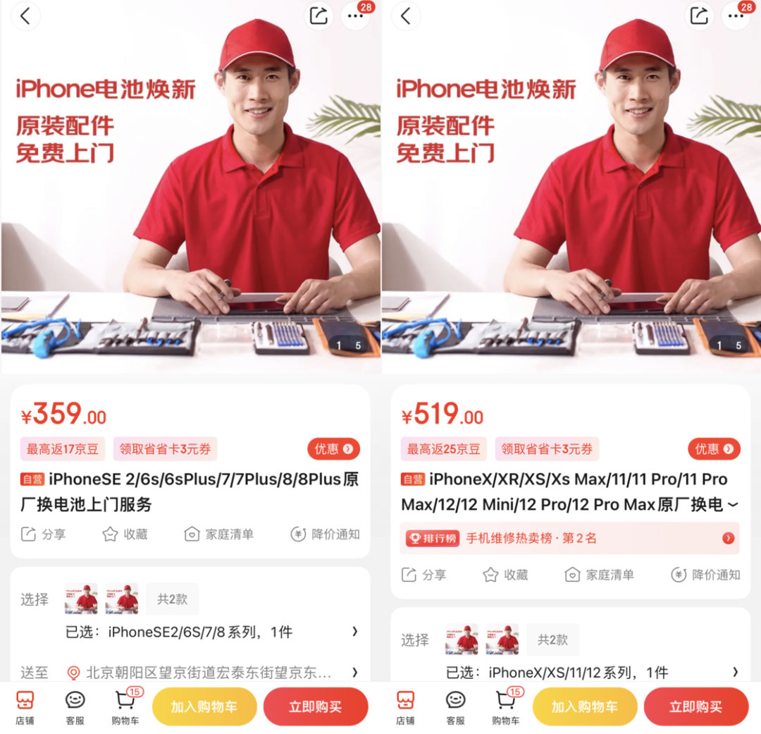 iPhone 原厂电池五折更换按照型号主要分为两大类,一类是针对 iPhoneX 系列、iPhone 11 系列和 iPhone 12 系列原厂电池更换服务,原价为 519 元,5 折后 259.5 元;另外一类则是第二代 iPhoneSE、iPhone6、7、8 系列的,价格相对便宜,为 179.5 元。