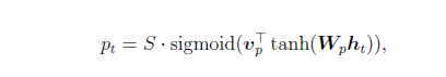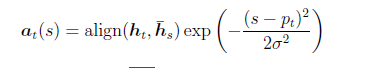 Local Attention首先会为decoder端当前的词,预测一个source端对齐位置(aligned position)pt,然后基于pt选择一个窗口,用于计算背景向量ct。Position pt的计算公式如下: