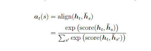 在t时刻,首先基于decoder的隐状态ht和源端的隐状态hs,计算一个变长的隐对齐权值向量at,其计算公式如下: