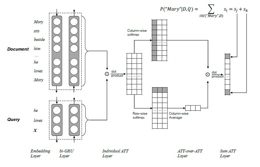 两个输入,一个Document和一个Query,分别用一个双向的RNN进行特征抽取,得到各自的隐状态h(doc)和h(query),然后基于query和doc的隐状态进行dot product,得到query和doc的attention关联矩阵。然后按列(colum)方向进行softmax操作,得到query-to-document的attention 值a(t);按照行(row)方向进行softmax操作,得到document-to-query的attention值b(t),再按照列方向进行累加求平均得到平均后的attention值b(t)。最后再基于上一步attention操作得到a(t)和b(t),再进行attention操作,即attention over attention得到最终query与document的关联矩阵。