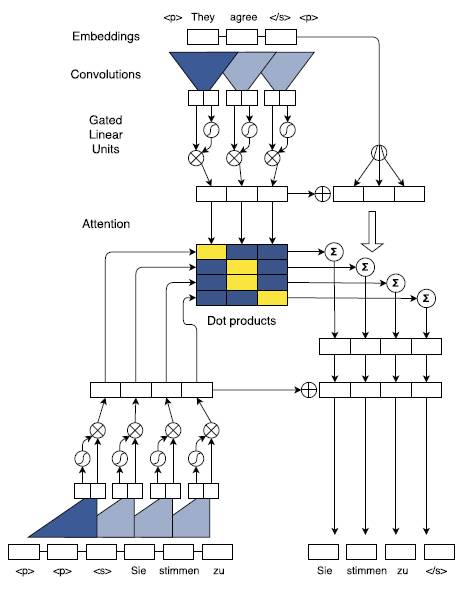 2017年,FaceBook 人工智能实验室的Jonas Gehring等人在论文《Convolutional Sequence to Sequence Learning》提出了完全基于CNN来构建Seq2Seq模型,除了这一最大的特色之外,论文中还采用了多层Attention Mechanism,来获取encoder和decoder中输入句子之间的关系,结构如图12所示。