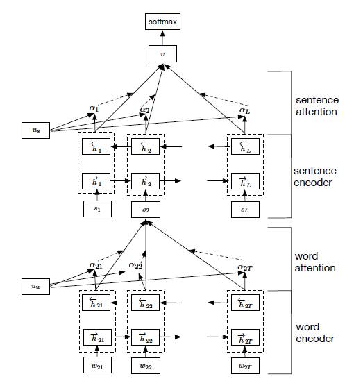 Zichao Yang等人在论文《Hierarchical Attention Networks for Document Classification》提出了Hierarchical Attention用于文档分类。Hierarchical Attention构建了两个层次的Attention Mechanism,第一个层次是对句子中每个词的attention,即word attention;第二个层次是针对文档中每个句子的attention,即sentence attention。网络结构如图10所示。