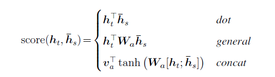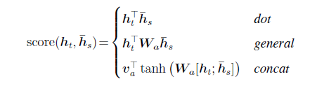 其中,Score(ht,hs) = aij表示源端与目标单单词对齐程度。可见,常见的对齐关系计算方式有,点乘(Dot product),权值网络映射(General)和concat映射几种方式。