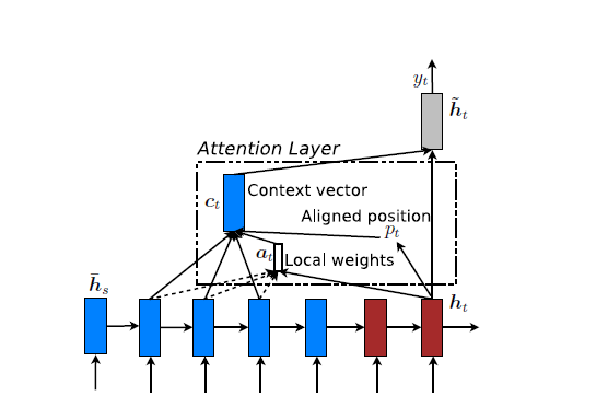 Local Attention:Global Attention有一个明显的缺点就是,每一次,encoder端的所有hidden state都要参与计算,这样做计算开销会比较大,特别是当encoder的句子偏长,比如,一段话或者一篇文章,效率偏低。因此,为了提高效率,Local Attention应运而生。