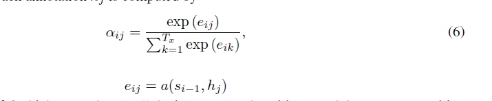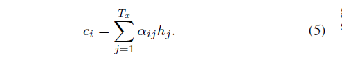 这里的背景向量ci的计算方式,与传统的Seq2Seq模型直接累加的计算方式不一样,这里的ci是一个权重化(Weighted)之后的值,其表达式如公式5所示: