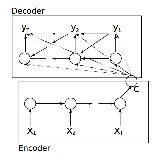 如上文所述,传统的Seq2Seq模型对输入序列X缺乏区分度,因此,2015年,Kyunghyun Cho等人在论文《Learning Phrase Representations using RNN Encoder–Decoder for Statistical Machine Translation》中,引入了Attention Mechanism来解决这个问题,他们提出的模型结构如图4所示。