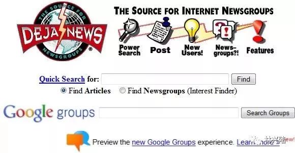 曾有一家叫 Deja 的新闻组归档被 Google 收购,后来成为 Google Groups 的重要组成部分,也就是最早出现在互联网上的新闻组。
