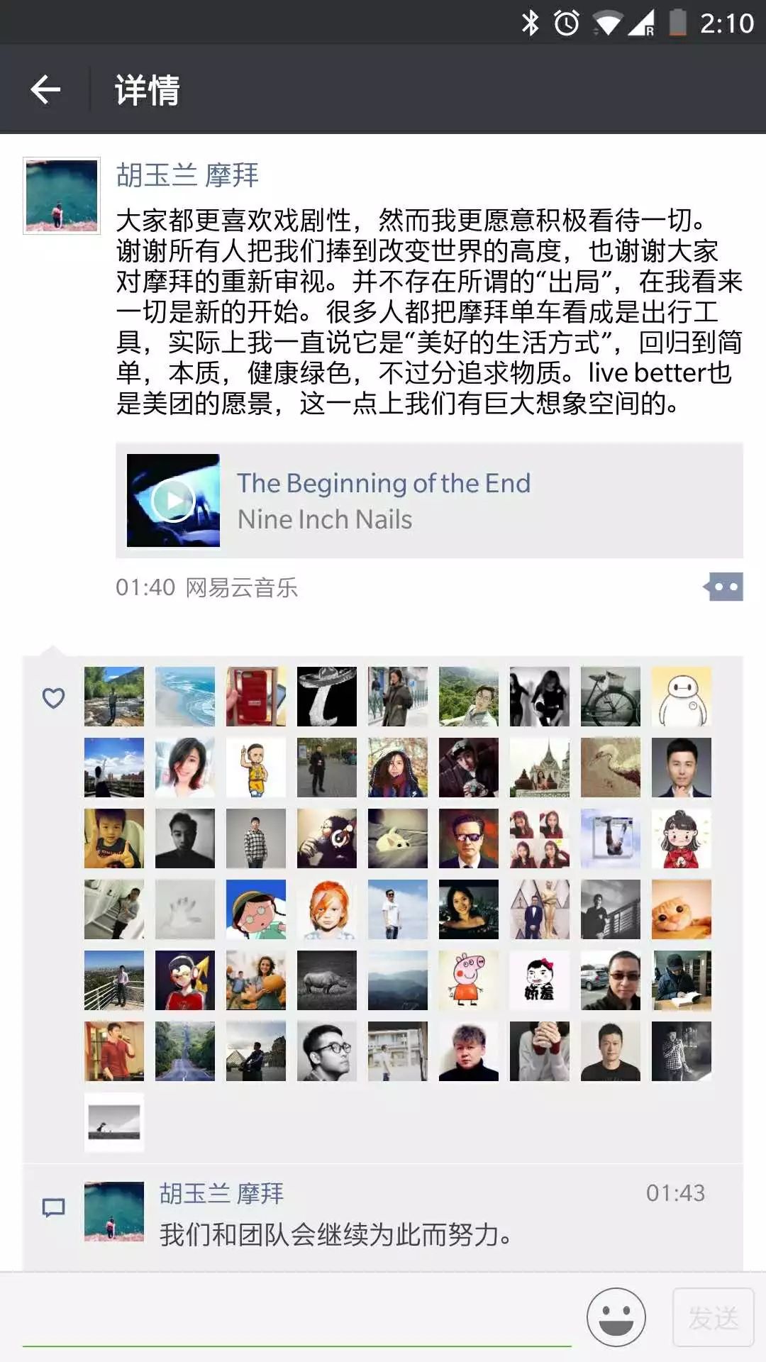 随后摩拜单车创始人胡玮炜深夜发声证实美团收购摩拜,称并不存在所谓的“出局”,在我看来一切是新的开始。美团创始人、CEO王兴也发文表示,摩拜将和美团一起开创更辉煌的未来。