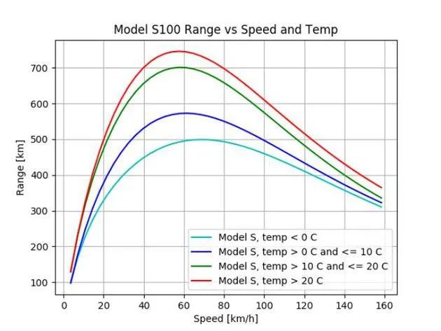 一份 ABRP(海外电动汽车行程规划工具)统计的 511 辆特斯拉 Model S100 日常使用数据显示,车速在 50-60 km/h 时的电动机效率最佳,超过该区间后效率明显下降。在对电池相对友好的 10℃以上的环境内,Model S100 的 120km/h 匀速续航里程,甚至还不到 50-60 km/h 的三分之二。