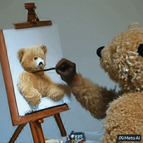 例如输入「A teddy bear painting a portrait」,即「一只画自画像的泰迪熊」,Make-A-Video 生成的视频如下动图所示: