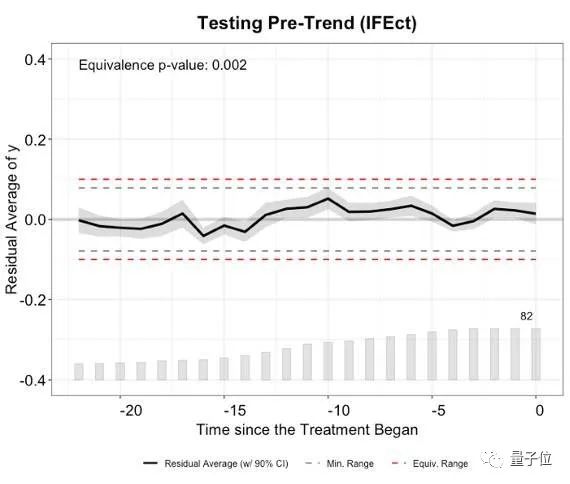 为了检验该模型的量化结果,科学家们还引入了Pre-Trend检验图,来证明模型的有效性(估计值与真实值残差趋于0波动)。