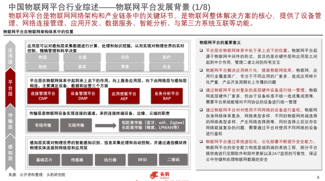 云平台是物联网体系的重要组成。物联网平台起源于物联网中间件的形式,其目的是在硬件层和应用层之间起到中介作用,管理二者之间的所有交互。同时物联网平台解决应用碎片化,提高物联网效率。物联网,应用行业覆盖面广,专注于不同应用的厂家多,造成应用碎片化严重,产品开发周期长上市慢的问题。