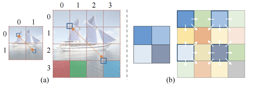 此外,本文针对传统位置编码提出两个重要问题。第一,对于图像生成任务,在计算 PE(位置编码)时,是否应该考虑图像语义? 传统的 PE 是根据按照逻辑排序的句子来设计的,而图像序列是根据图像内容语义来组织的。假设两个图像补丁之间的距离为 d(.,.) 。如图 3(a) 右边部分所示,d((0 , 3 ), (1 , 3 )) (红色和绿色块) 之间的差异与 d(( 0 , 3 ), (3 , 3 )) (红色和青色 块) 之间的差异应该是相似的,因为风格化任务要求相似的内容补丁有相似的风格化结果。第二,当输入图像尺寸呈指数级增大时,传统的正弦位置编码是否仍然适用于视觉任务? 如 3(a) 所示,当图像大小发生变化时,相同语义位置的补丁 (用蓝色小矩形表示) 之间的相对距离会发生显著变化,这不适合视觉任务中的多尺度输入要求。