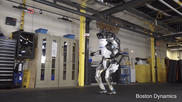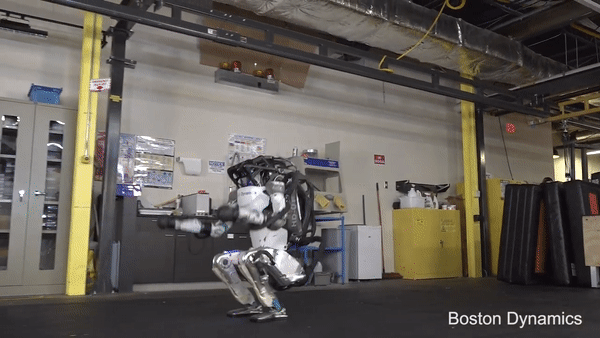 对于一个巨大、沉重的机器人(之前透露的数字约160斤)来说,这是一个新的挑战。在完成跑酷跳跃时,机器人需要控制好重心和动力分配,而且需要不断改变跳跃的方向。