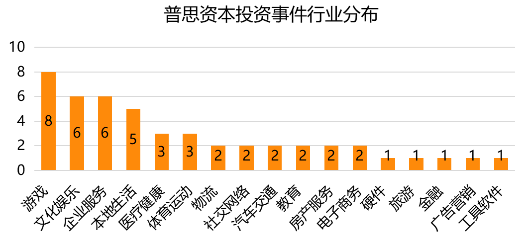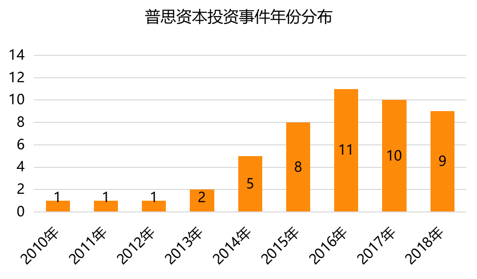 从投资活跃度时间分布来看,成立初期的普思资本还比较谨慎,最初三四年,每年也只有一两次的出手,到 2014 年后续活跃度逐渐提升。2016 年普思资本最为活跃,共参与 11 起投资事件。