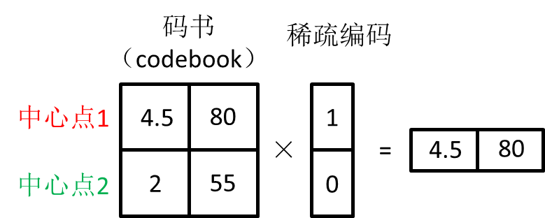 矢量量化是一种数据压缩技术,目前主要在语音、图像和视频的压缩中被广泛使用。矢量量化的核心思想很简单,将相似数据进行聚类,同一类中的数据点用一个代表值来替换,并将所有的数据用一个矢量表示。举一个简单的例子,如图2所示,数据分布在一个二维平面中,根据矢量量化的原理,1)先将数据进行聚类;2)找到数据聚类的中心点:(4.5, 80)和(2, 55),并生成码书(code book);3)将所有数据按照码书,生成对应的稀疏编码。这种编码的优点是能够对原始数据产生非常高的数据压缩比(在图2的例子中,所有二维平面上的数据只用了2个数据点即可表示),且简单易行。我们所熟悉的jpeg,mpeg-4等媒体的压缩格式中,都有利用矢量量化进行数据编码的过程。在矢量量化中,稀疏编码表示的是数据所属的分类信息。矢量量化的技术难点在于定义码书的过程,从最早通过解多维积分问题到后来通过数据训练(LBG-VQ,SDL,K-SVD)获得,其技术已逐步成熟并市场化。