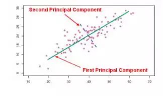 非负矩阵分解是矩阵分解的一类方法。先来简要介绍下矩阵分解。和矢量量化相同的是,矩阵分解可以被用来作为数据压缩的一种手段。不同的是,矩阵分解是通过保持原有信息尽可能不丢失的基础上,找到用于数据压缩的一组基。用一种比较形象的方式解释:原有数据(例如,人的行为数据、交通数据、气象数据等等)坐落在一个高维的空间(n维空间)中,矩阵分解的目的是把原有的数据 “塞”到一个新的(k维,n远远大于k)空间中,同时还希望尽可能的保证原有数据信息不丢失。如图3所示,我们可以利用矩阵分解,找到二维数据空间的一维表示(绿色直线—压缩后的基向量,这里保证数据的散度尽可能不丢失),从而起到数据压缩的作用。