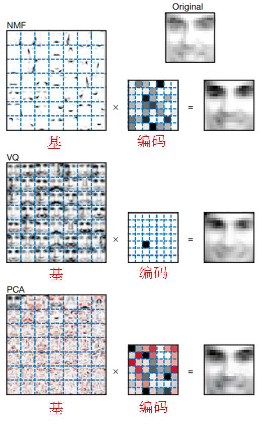 图 4 在人脸表示中,对比VQ(矢量量化)和PCA(主成分分析—矩阵分解),NMF能够获得表示人脸局部特征的基以及相对稀疏的编码