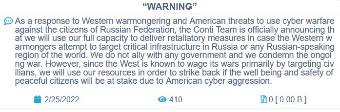 在2022年2月25日,Conti勒索软件团伙为了表明自己的立场,还发布了一篇博客文章,宣布他们将全力支持俄罗斯政府对乌克兰的攻击。他们还警告地说,如果有人组织了针对俄罗斯的网络攻击,Conti团伙将围绕关键基础设施进行反击。