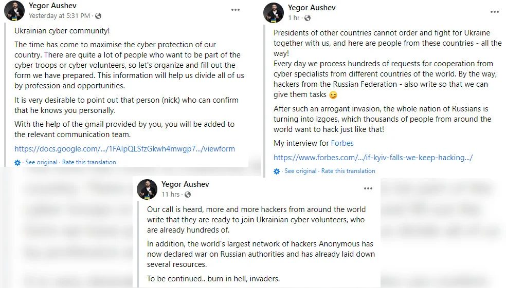 因此,Cyber Unit Technologies(网络安全指导组织)的创始人Yegor Aushev组织了一场号召行动,目的是为了寻求站在乌克兰一边的黑客,用这些黑客的力量来保护关键基础设施。之后他于2月24号晚分享了一份申请表,供志愿黑客注册,方便获得他们的技能,以便更好地组织任务。在一篇帖子中,Aushev声称,即使是世界各地的黑客,包括来自俄罗斯的黑客,也响应了他的号召,他们将分组进行进攻和防御行动。
