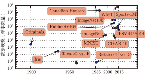 图3 与日俱增的数据量。20世纪初,统计学家使用数百或数千的手动制作的度量来研究数据集(Garson,1900;Gosset,1908;Anderson,1935;Fisher,1936)。20世纪50年代到80年代,受生物启发的机器学习开拓者通常使用小的合成数据集,如低分辨率的字母位图,设计为在低计算成本下表明神经网络能够学习特定功能(Widrow and Hoff,1960;Rumelhart et al.,1986b)。20世纪80年代和90年代,机器学习变得更偏统计,并开始利用包含成千上万个样本的更大数据集,如手写扫描数字的MNIST数据集(如图1.9所示)(Le Cun et al.,1998c)。在21世纪的第一个10年里,相同大小更复杂的数据集持续出现,如CIFAR-10数据集(Krizhevsky and Hinton,2009)。在这10年结束和接下来的5年,明显更大的数据集(包含数万到数千万的样例)完全改变了深度学习可能实现的事。这些数据集包括公共Street View House Numbers数据集(Netzer et al.,2011)、各种版本的Image Net数据集(Deng et al.,2009,2010a;Russakovsky et al.,2014a)以及Sports-1M数据集(Karpathy et al.,2014)。在图顶部,我们看到翻译句子的数据集通常远大于其他数据集,如根据Canadian Hansard制作的IBM数据集(Brown et al.,1990)和WMT2014英法数据集(Schwenk,2014)