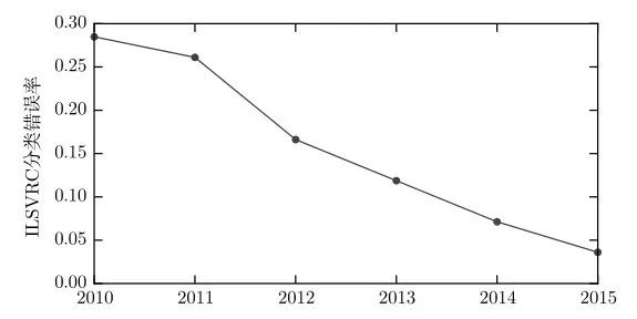 图7 日益降低的错误率。由于深度网络达到了在ImageNet大规模视觉识别挑战中竞争所必需的规模,它们每年都能赢得胜利,并且产生越来越低的错误率。数据来源于Russakovsky et al.(2014b)和He et al.(2015)