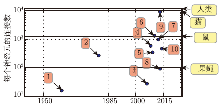 图5 与日俱增的每个神经元的连接数。最初,人工神经网络中神经元之间的连接数受限于硬件能力。而现在,神经元之间的连接数大多是出于设计考虑。一些人工神经网络中每个神经元的连接数与猫一样多,并且对于其他神经网络来说,每个神经元的连接数与较小哺乳动物(如小鼠)一样多,这种情况是非常普遍的。甚至人类大脑每个神经元的连接数也没有过高的数量。生物神经网络规模来自Wikipedia(2015)