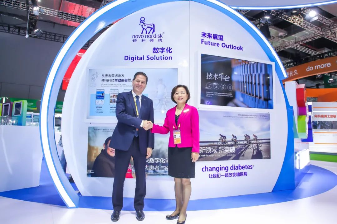 图为诺和诺德全球高级副总裁兼大中国区总裁周霞萍(右)与微软公司资深副总裁、微软大中华区董事长兼首席执行官柯睿杰(左)在诺和诺德进博会展台合影