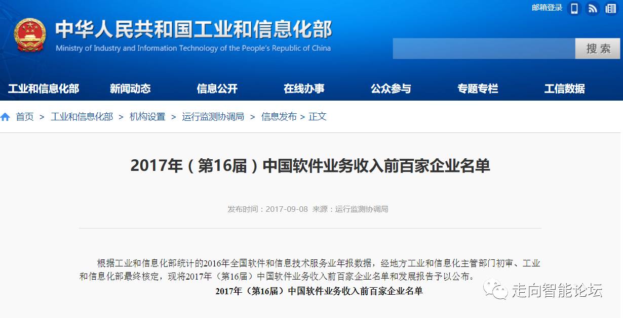 根据工业和信息化部统计的2016年全国软件和信息技术服务业年报数据,经地方工业和信息化主管部门初审、工业和信息化部最终核定,现将2017年(第16届)中国软件业务收入前百家企业名单和发展报告予以公布。
