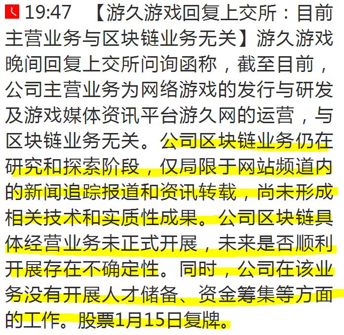 问询函中,上交所要求游久游戏结合目前区块链技术的研究、应用阶段,并根据目前生产经营、人才资金储备等现状,说明前述有关区块链业务对公司经营的影响;并要求公司在2018年1月13日前回复。