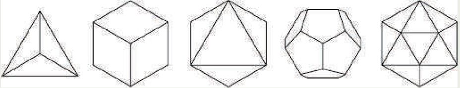 如果一个凸多面体的小面是全等的规则多边形,则称为规则多面体。这样的规则凸多面体只有五种,即正四面体(tetrahedron,小面为三角形),正六面体(cube,立方体,小面为正方形),正八面体(octahedron, 小面为三角形), 正十二面体(dodecahedron,小面为五边形) 和正二十面体(icosahedron,小面为三角形),见图2。柏拉图时期人们就知道这五种规则多面体。在《蒂迈欧》一书中,柏拉图猜测地上的四种元素风、火、水和土以及天上的quintessence (即第五种存在)就分别对应这五种形状,因此这五种规则多面体又称为柏拉图多面体(Platonic solids)。具体地,正四面体对应火,正六面体对应土,正八面体对应气,正二十面体对应水, 而正十二面体对应quintessence 或者宇宙。整个天体为球体。后来,开普勒用它们构造宇宙的模型(图3)。柏拉图和开普勒这类人之所以是智者,就在于他们模糊的认识在后来被发现包含着最深刻的道理。这些多面体由球脱胎而来,数学上这些几何体的对称群是球对称群SO(3)的子群,而物理上一个球形液滴冷却后结晶,即发生对称性破缺,留下了对称性较低的固体颗粒。据信人类在四千年前就制作出这五种规则多面体了(图4)。不过,远古人类为什么要用石头制作正多(曲)面体,十分费解。