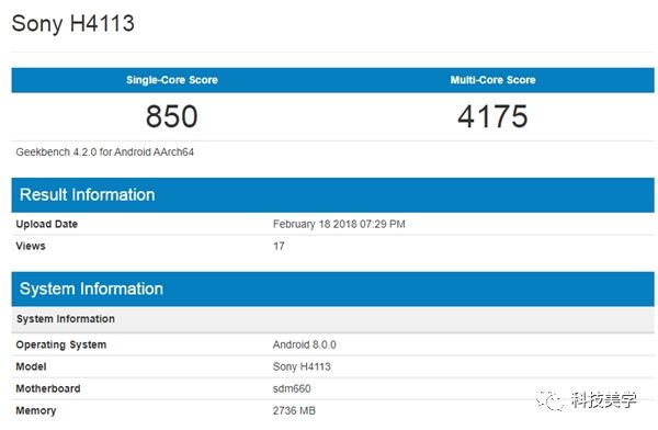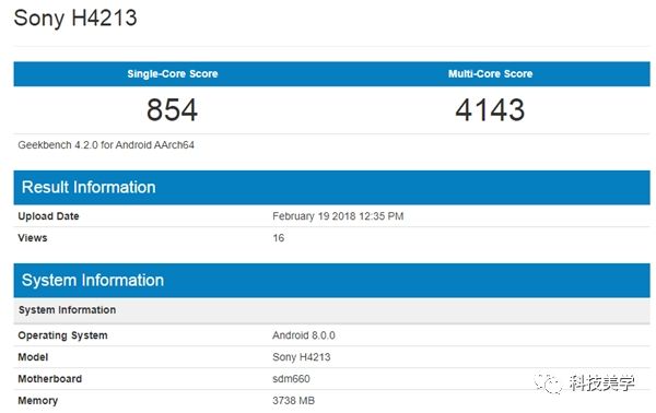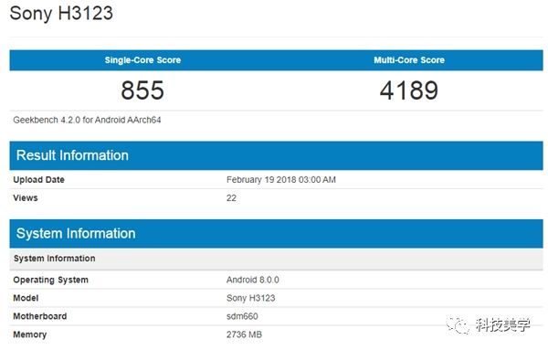 2月21日,三款型号分别为H3123、H4113和H4213的新机现身跑分网站GeekBench,这三款新机均搭载了高通骁龙660处理器,预装安卓8.0系统。其中索尼H3123和H4113均配备了3GB内存,而H4213配备的是4GB内存。