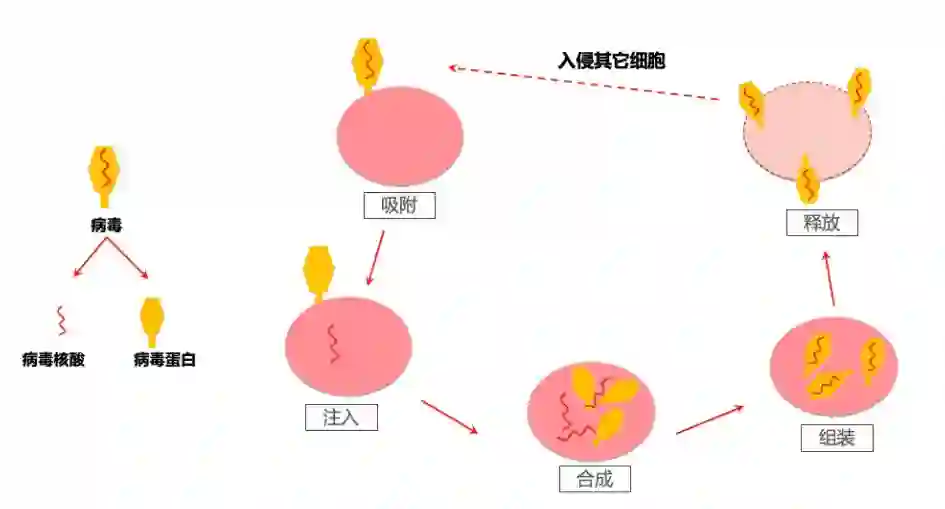 病毒进入宿主细胞后,病毒基因组完成复制、转录(除了正译 RNA 病毒外)以及病毒蛋白质合成,然后组装行成更多数目的病毒,其生命流程如下图所示(无包膜病毒简易示图)。