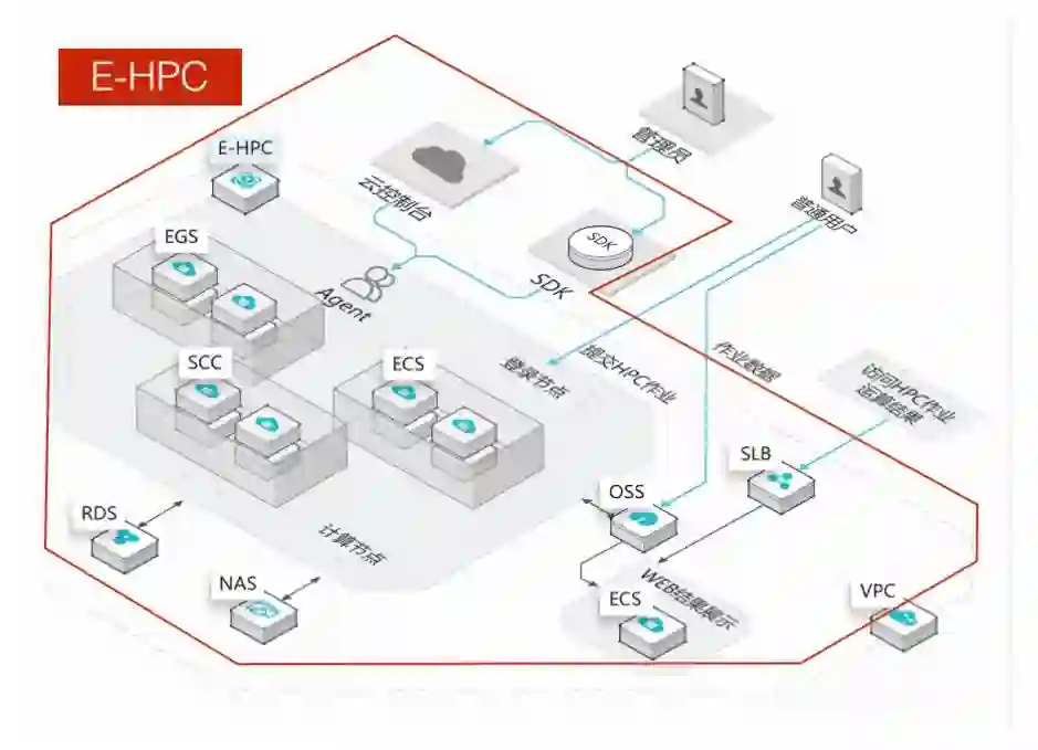 阿里云 E-HPC 云超算产品是云原生的高性能计算集群解决方案,将阿里云的计算产品(ECS/EGS/裸金属服务器/超级计算集群)、网络(VPC/RoCE)和存储(NAS/OSS/CPFS)等产品进行整合,配置高性能计算作业管理和账户管理,并集成常用的 HPC 应用软件,实现让用户在页面操作,获取自己的高性能计算集群,拥有 root 权限,对集群进行管理配置。
