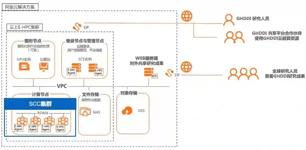 GHDDI 在阿里云之上搭建了开放共享平台,使用 E-HPC 搭建高性能计算集群,用于药物研发的模拟计算,同时为合作伙伴创建不同的云超算子账户,实现计算资源共享。