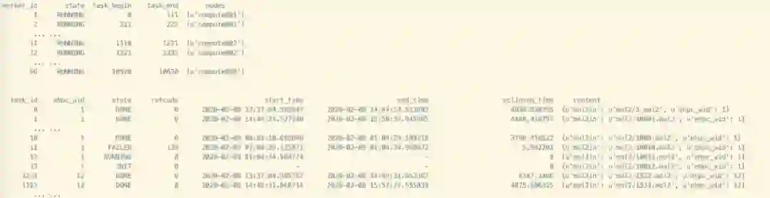 使用 ehpcarr 命令,根据作业号进行查询任务的并发执行情况。从查询结果可以得倒每个任务当前的处理状态,包括完成(DONE)、运行(RUNNING)、失败(FAILED)、排队(INIT),每个任务处理的启示截止时间,通过对任务执行时间可以预估下次使用的计算资源。