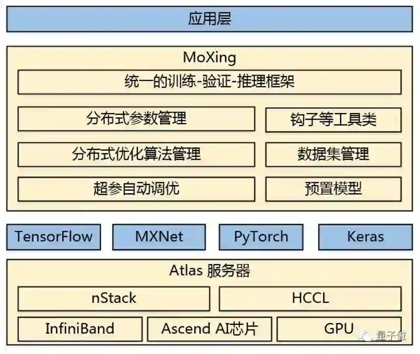 在模型训练部分,ModelArts通过硬件、软件和算法协同优化来实现训练加速。尤其在深度学习模型训练方面,华为将分布式加速层抽象出来,形成一套通用框架——MoXing(“模型”的拼音,意味着一切优化都围绕模型展开)。